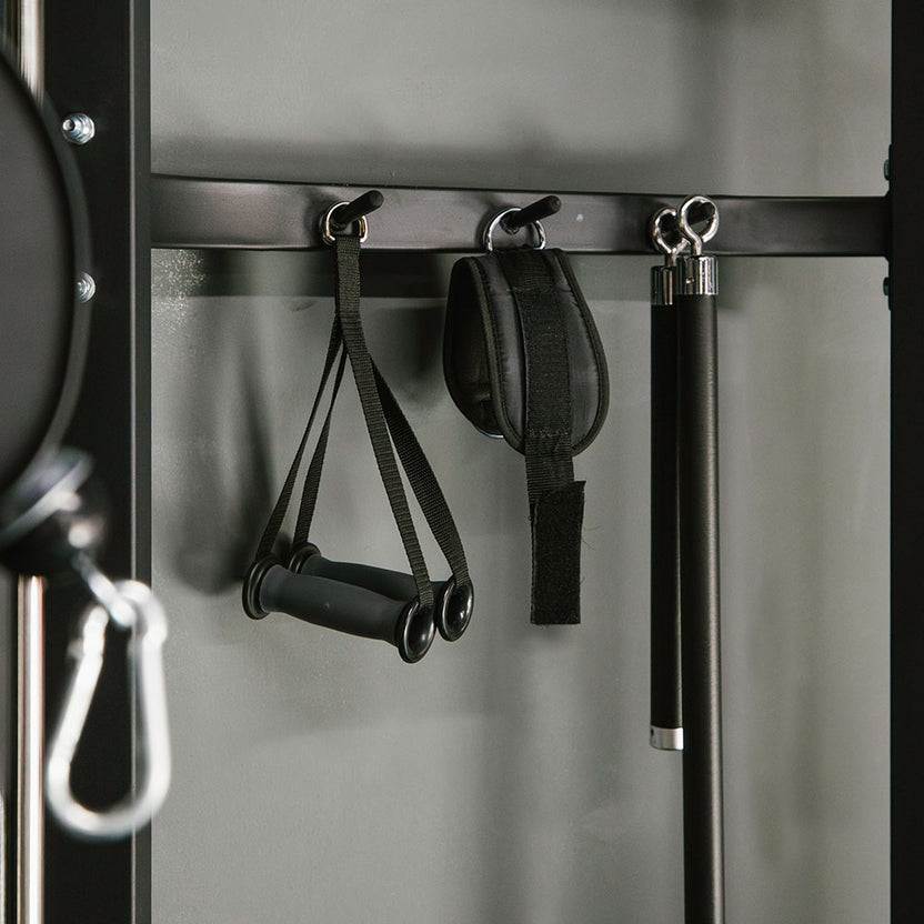 This functional trainer comes with a rope handle, single D and double D handles, long bar and short bar handles, and dual short strap handles - plus integrated pull-up handles for even more variety.